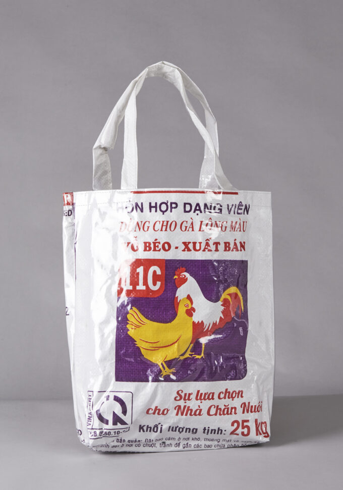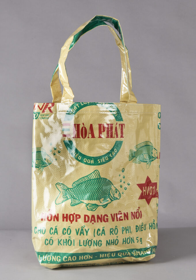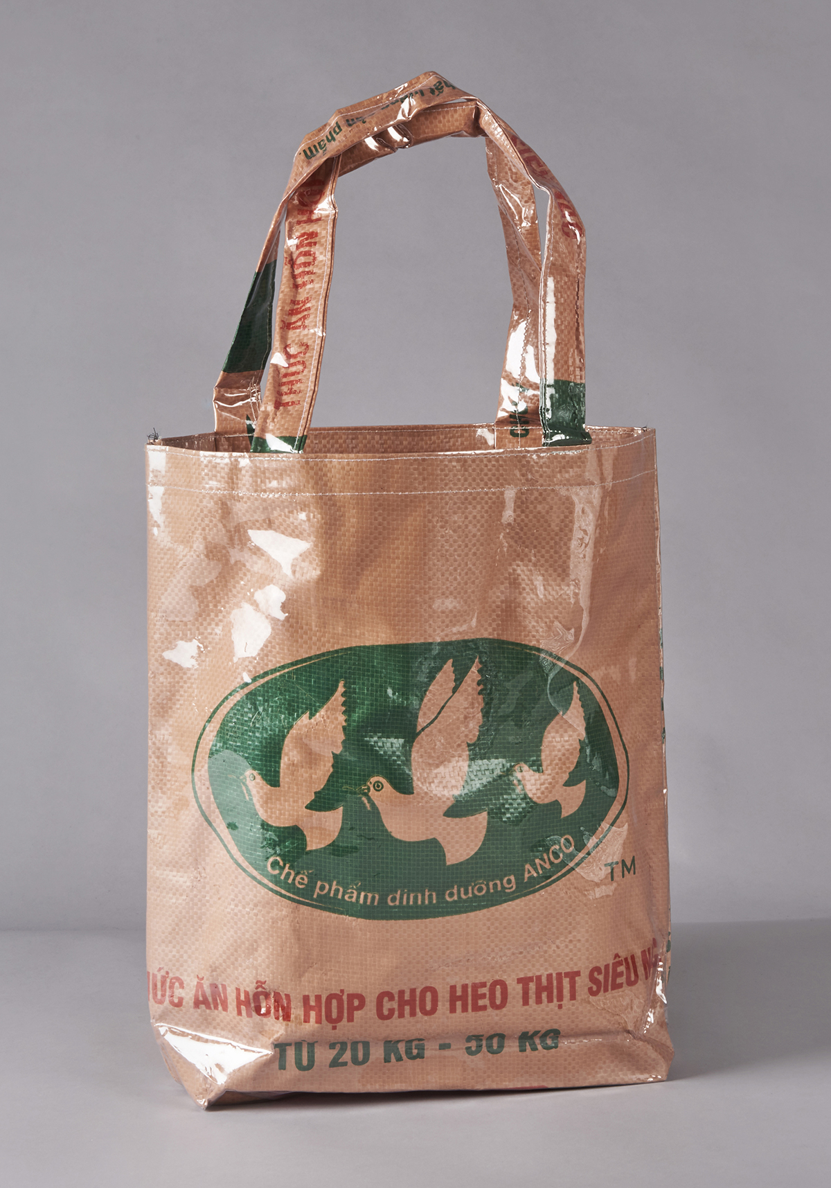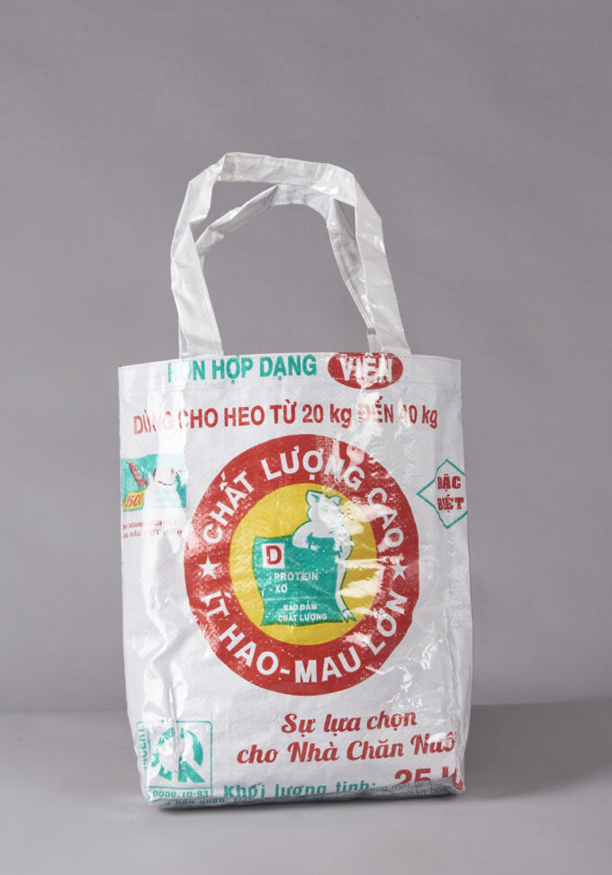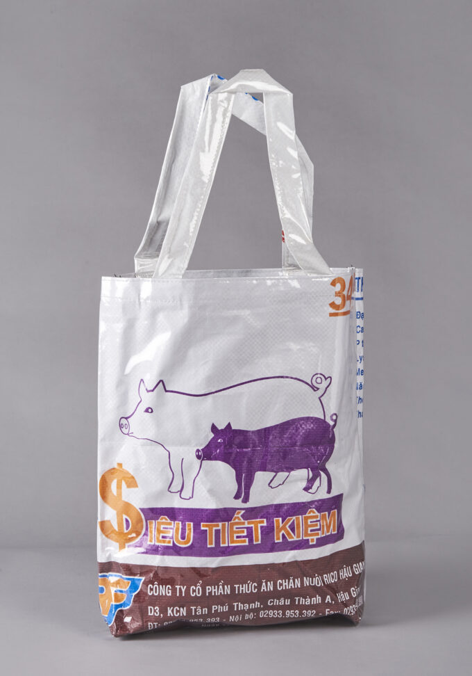 Questa borsa è confezionata da artigiani vietnamiti in materiale riciclato da sacchi di riso usati. E’ foderata all’interno e contiene una busta porta oggetti. E’ rivestita da Pvc trasparente che la rende lucida.