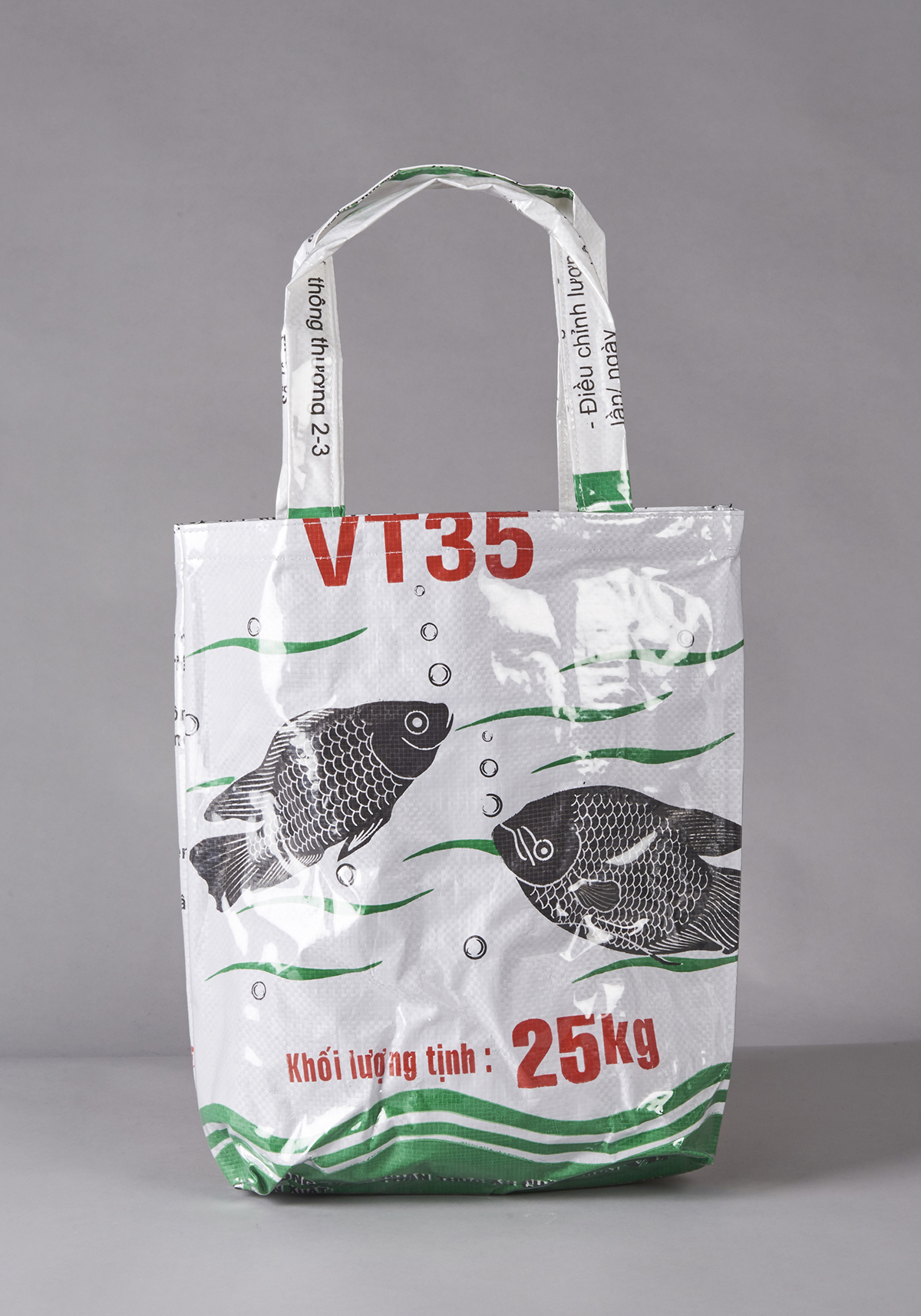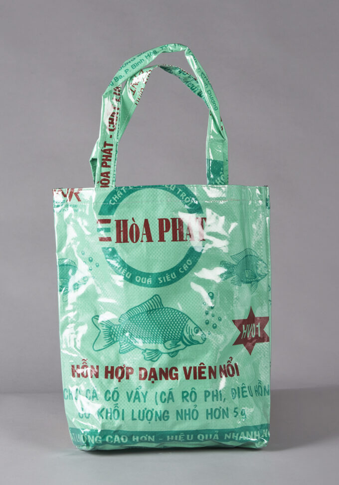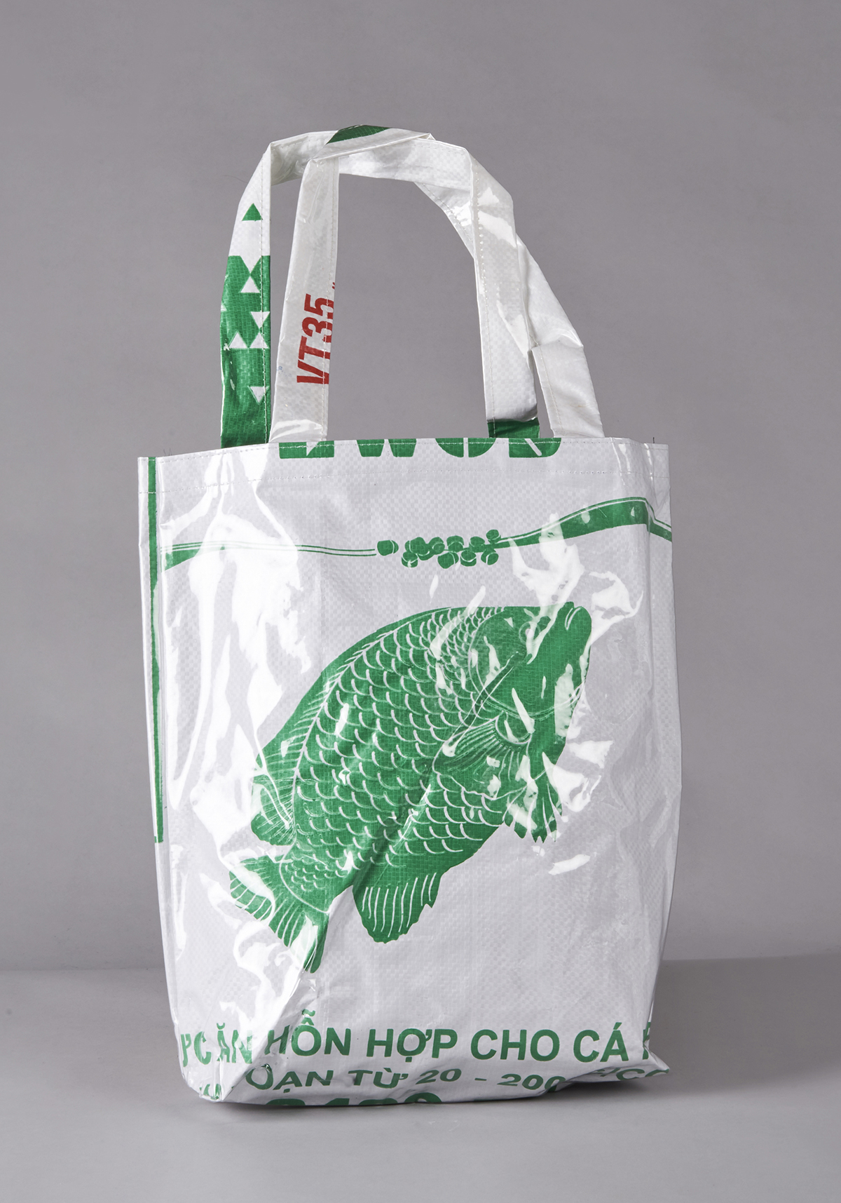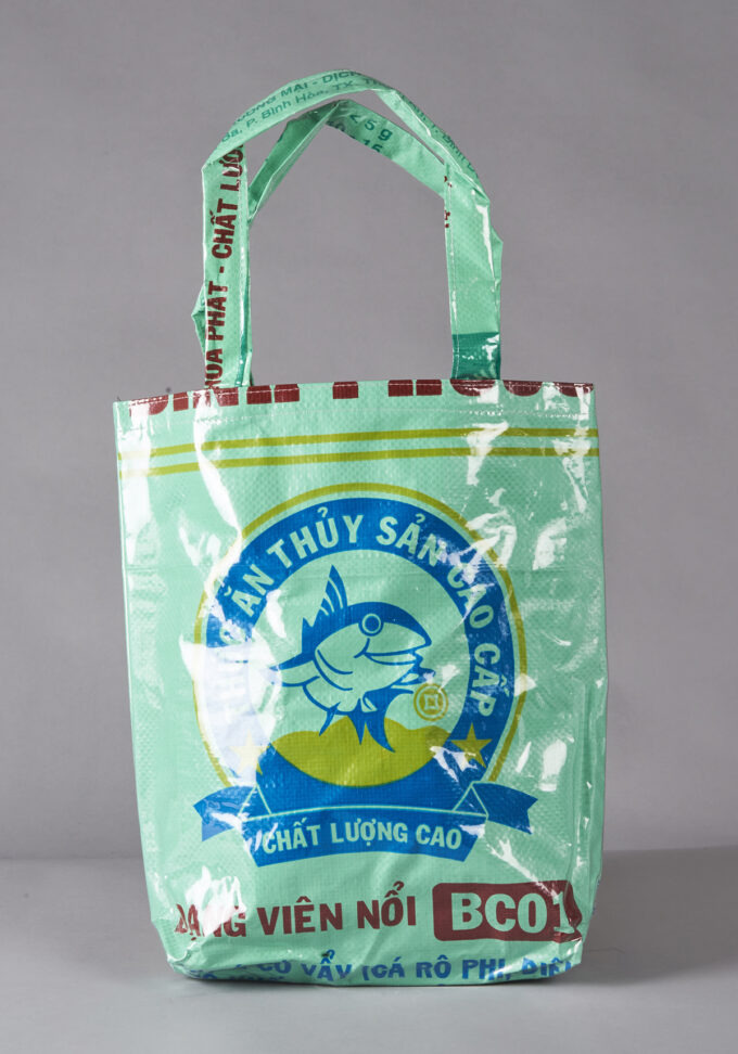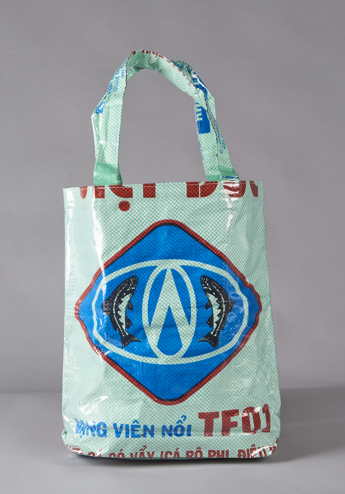 Questa borsa è confezionata da artigiani vietnamiti in materiale riciclato da sacchi di riso usati. E’ foderata all’interno e contiene una busta porta oggetti. E’ rivestita da Pvc trasparente che la rende lucida.