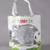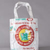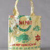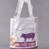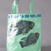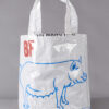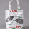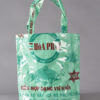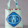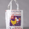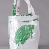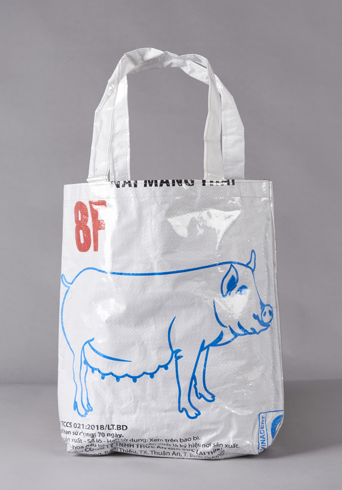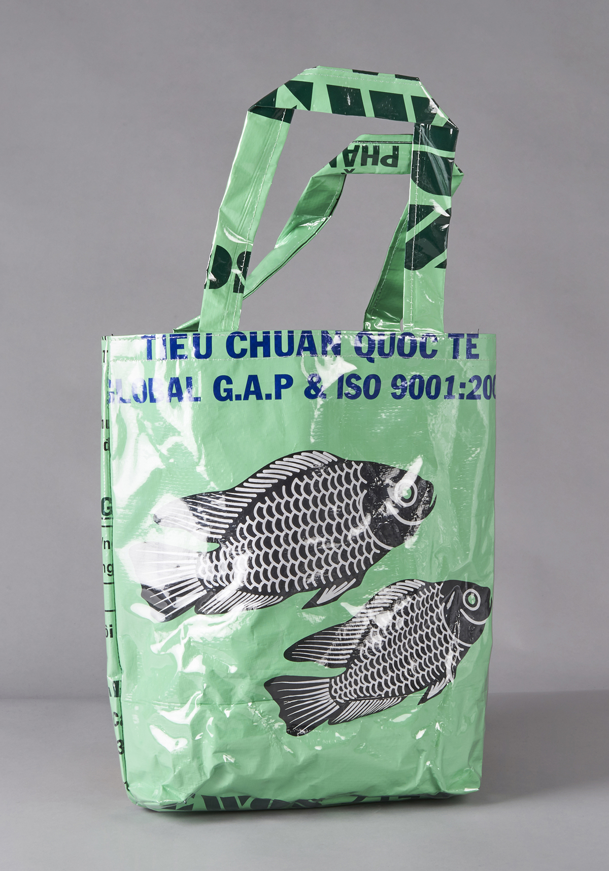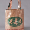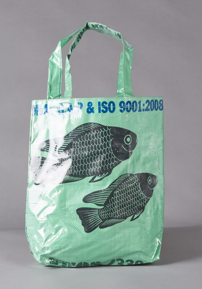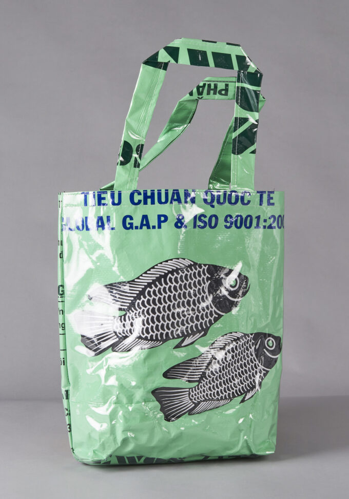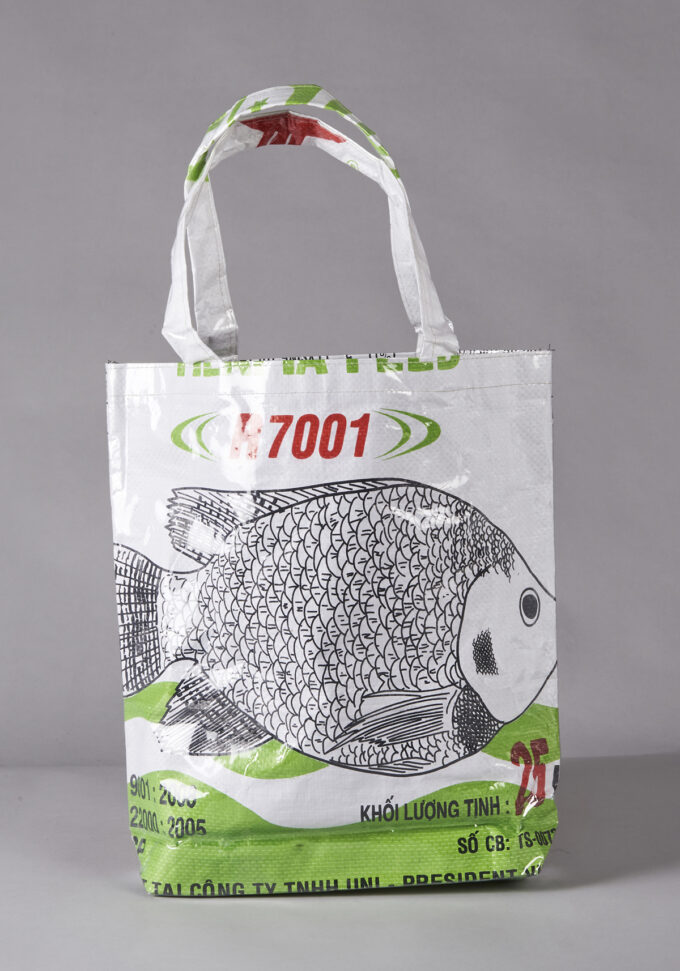 Questa borsa è confezionata da artigiani vietnamiti in materiale riciclato da sacchi di riso usati. E’ foderata all’interno e contiene una busta porta oggetti. E’ rivestita da Pvc trasparente che la rende lucida.