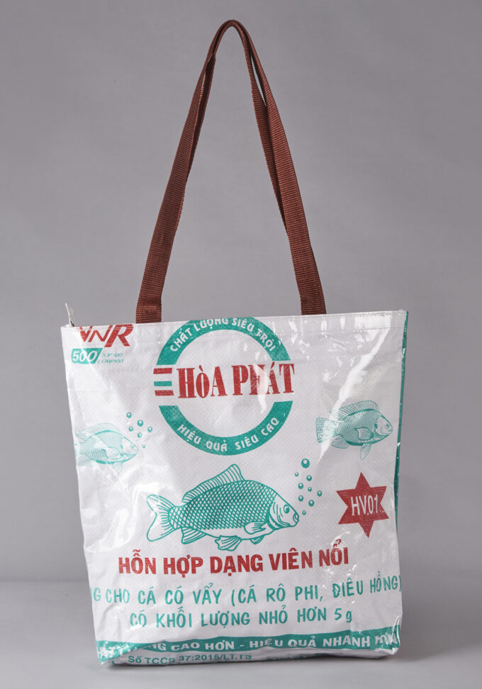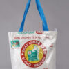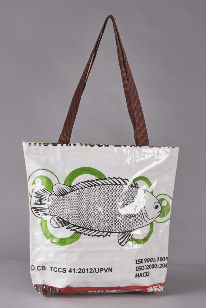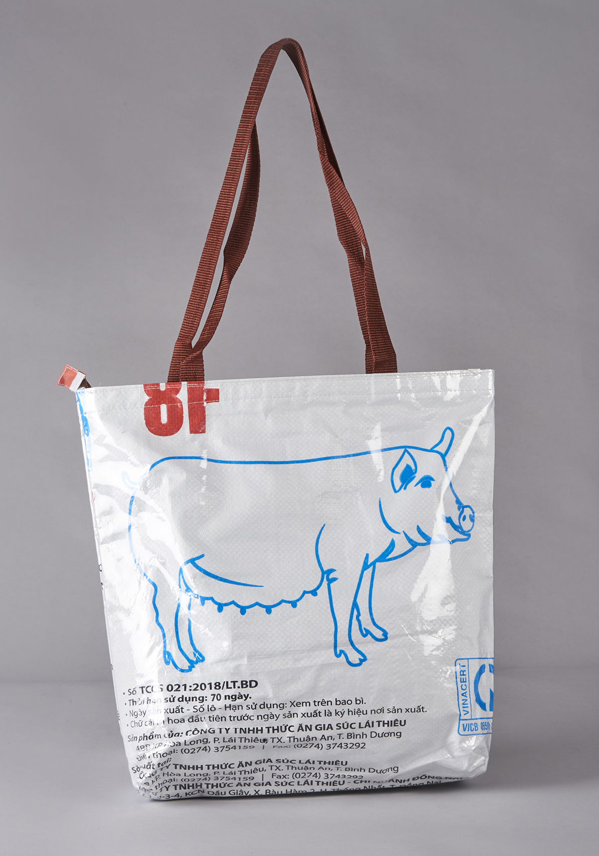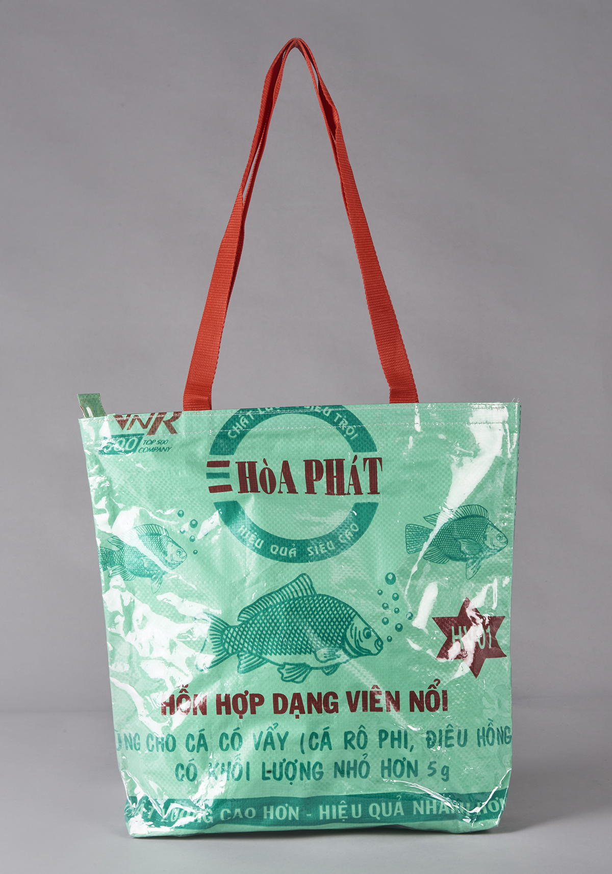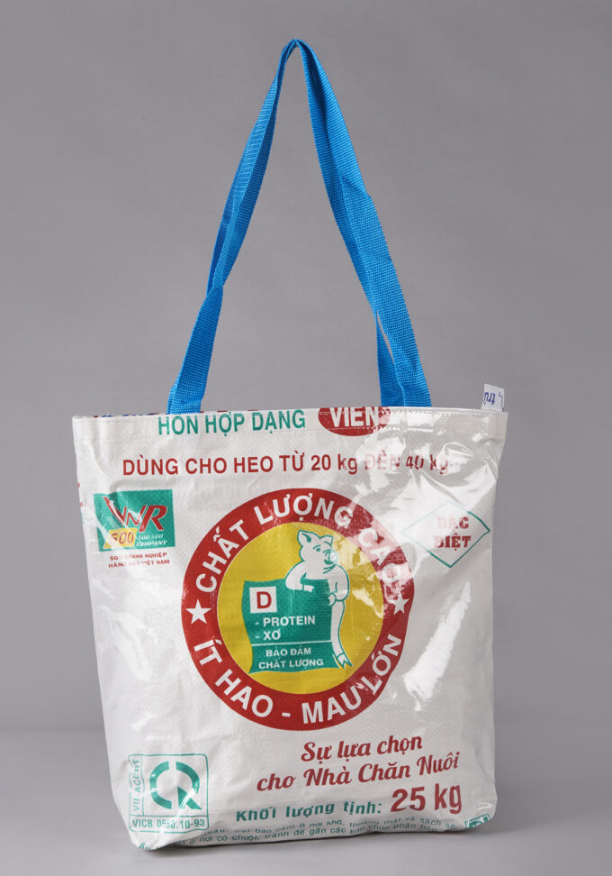 Questa borsa è confezionata da artigiani vietnamiti in materiale riciclato da sacchi di riso usati. E’ foderata all’interno e contiene una busta porta oggetti. E’ rivestita da Pvc trasparente che la rende lucida.