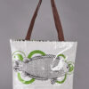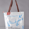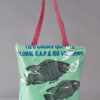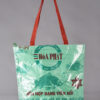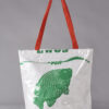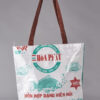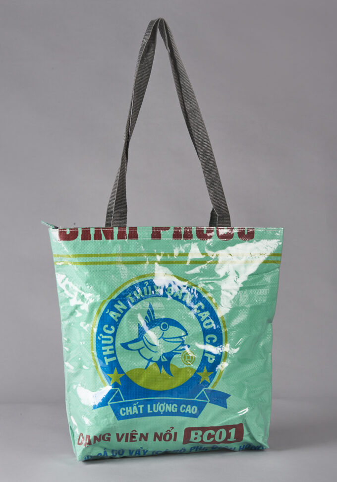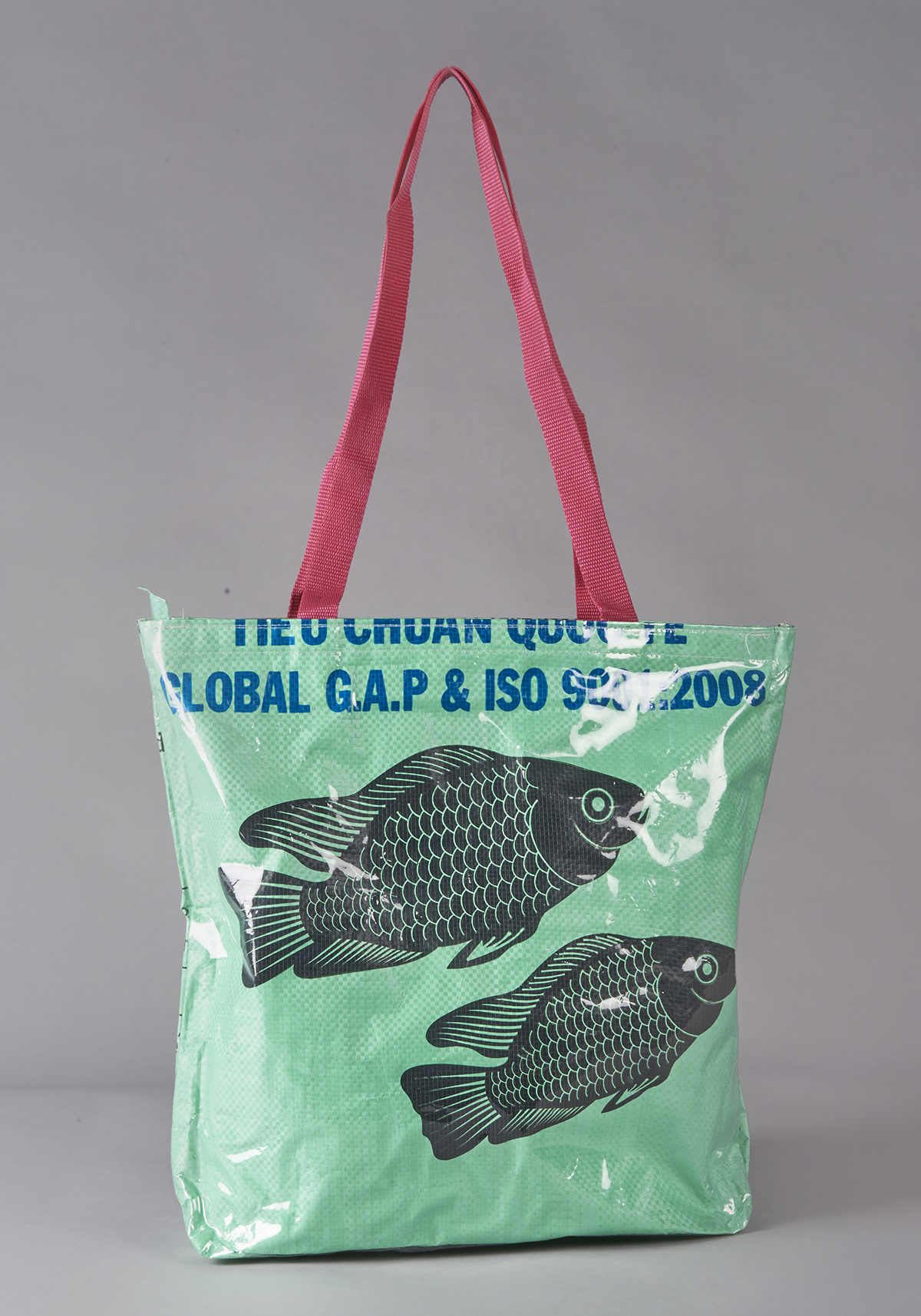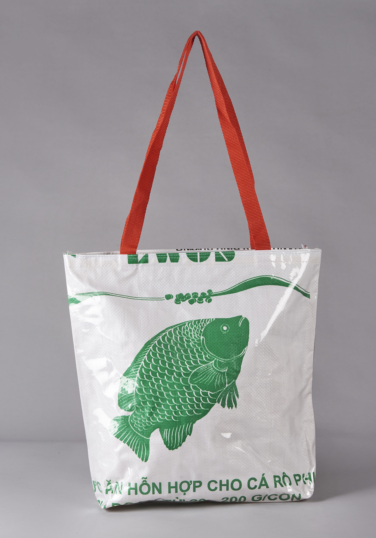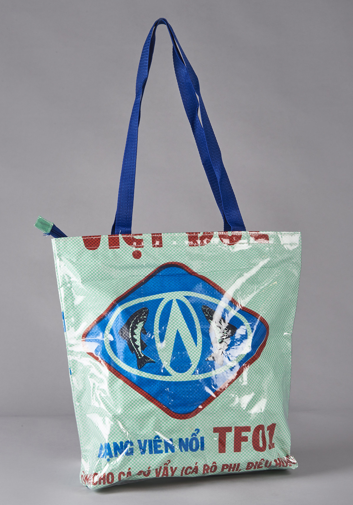 Questa borsa è confezionata da artigiani vietnamiti in materiale riciclato da sacchi di riso usati. E’ foderata all’interno e contiene una busta porta oggetti. E’ rivestita da Pvc trasparente che la rende lucida.
