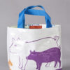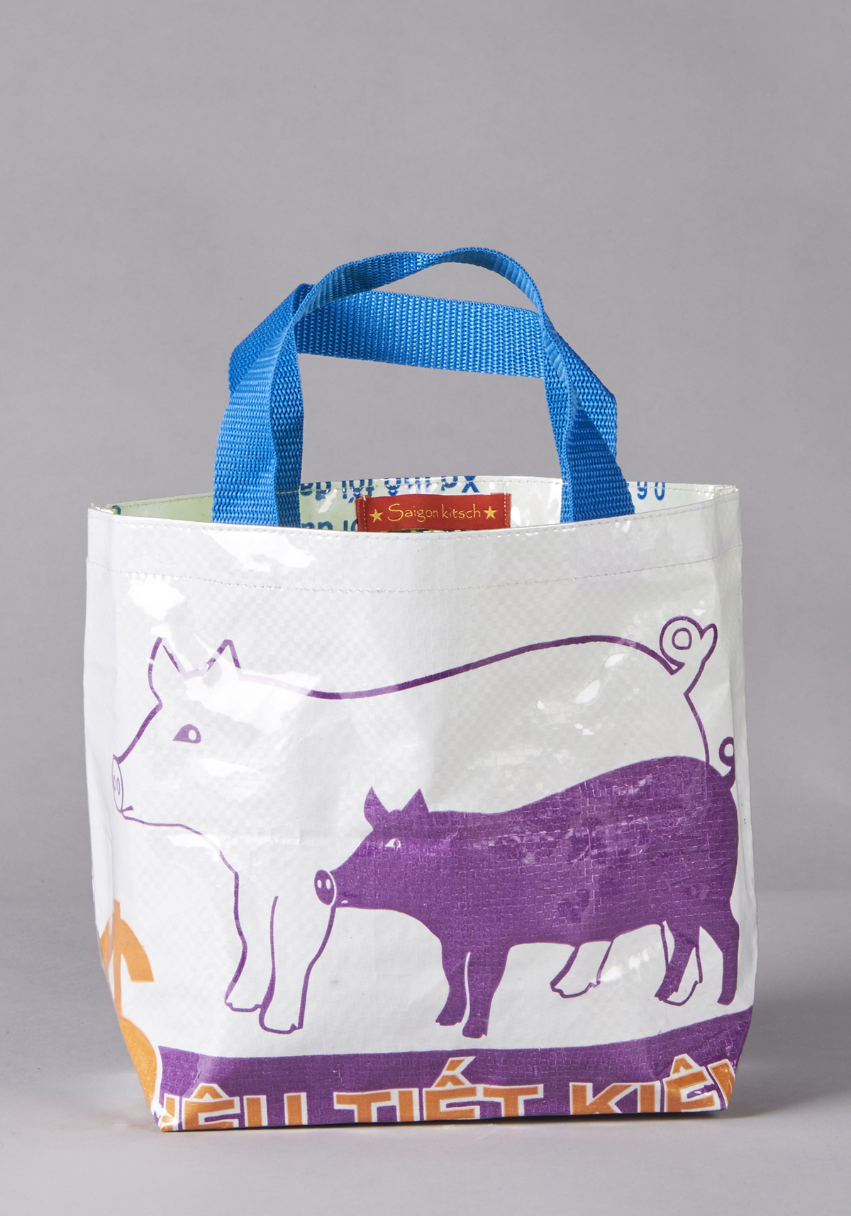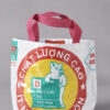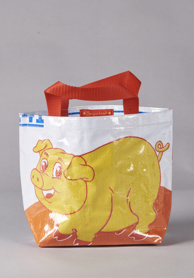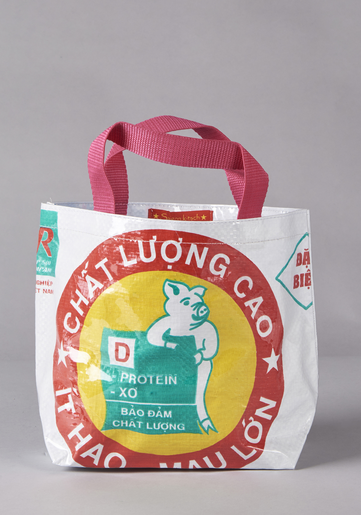 Questa borsa a secchiello è confezionata da artigiani vietnamiti in materiale riciclato da sacchi di riso usati.