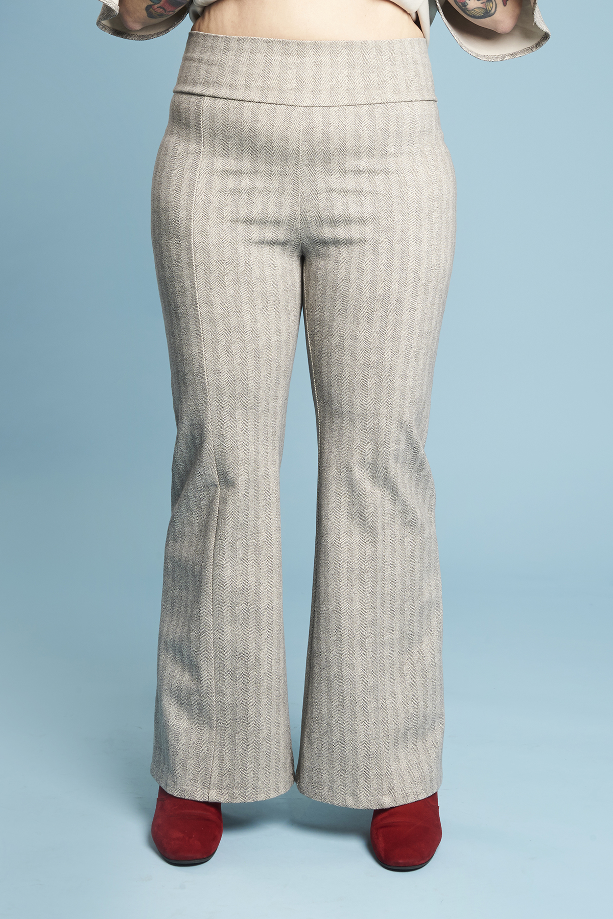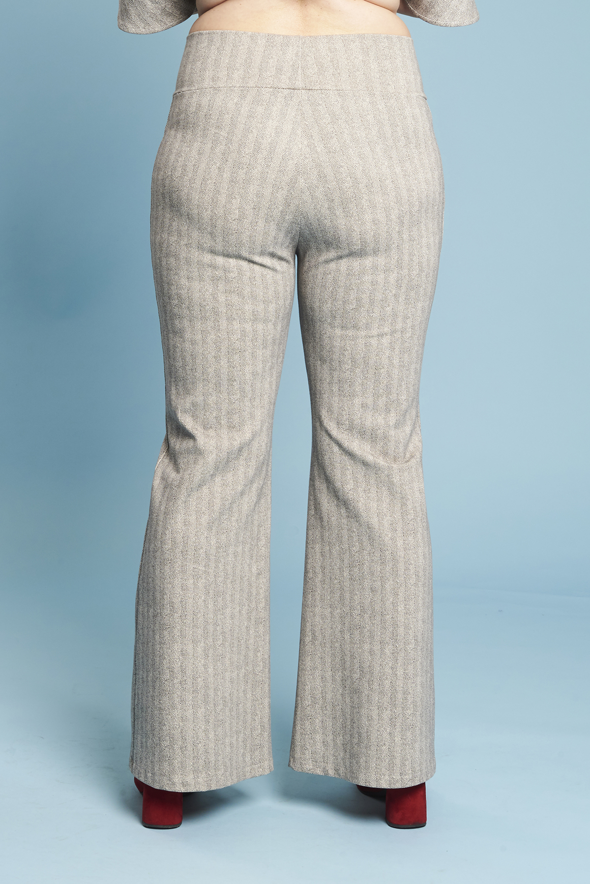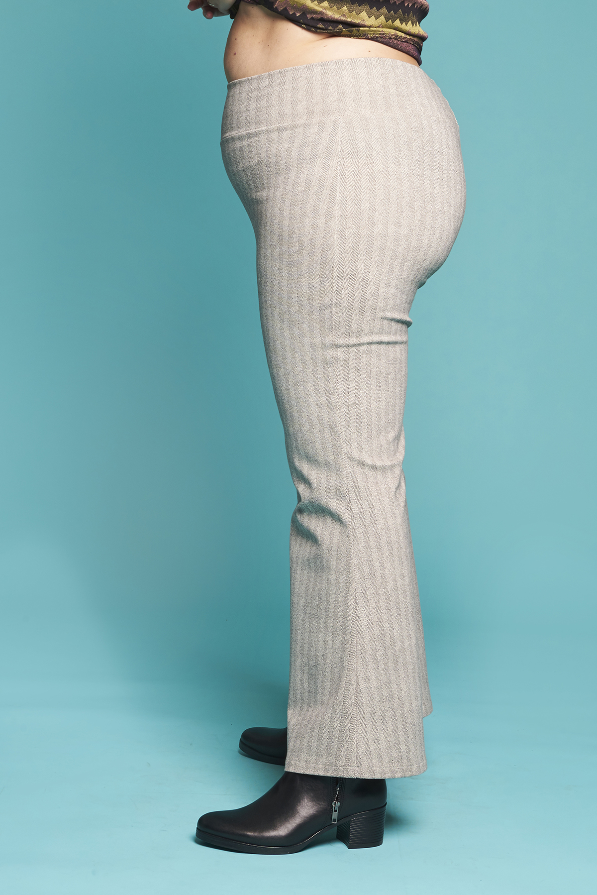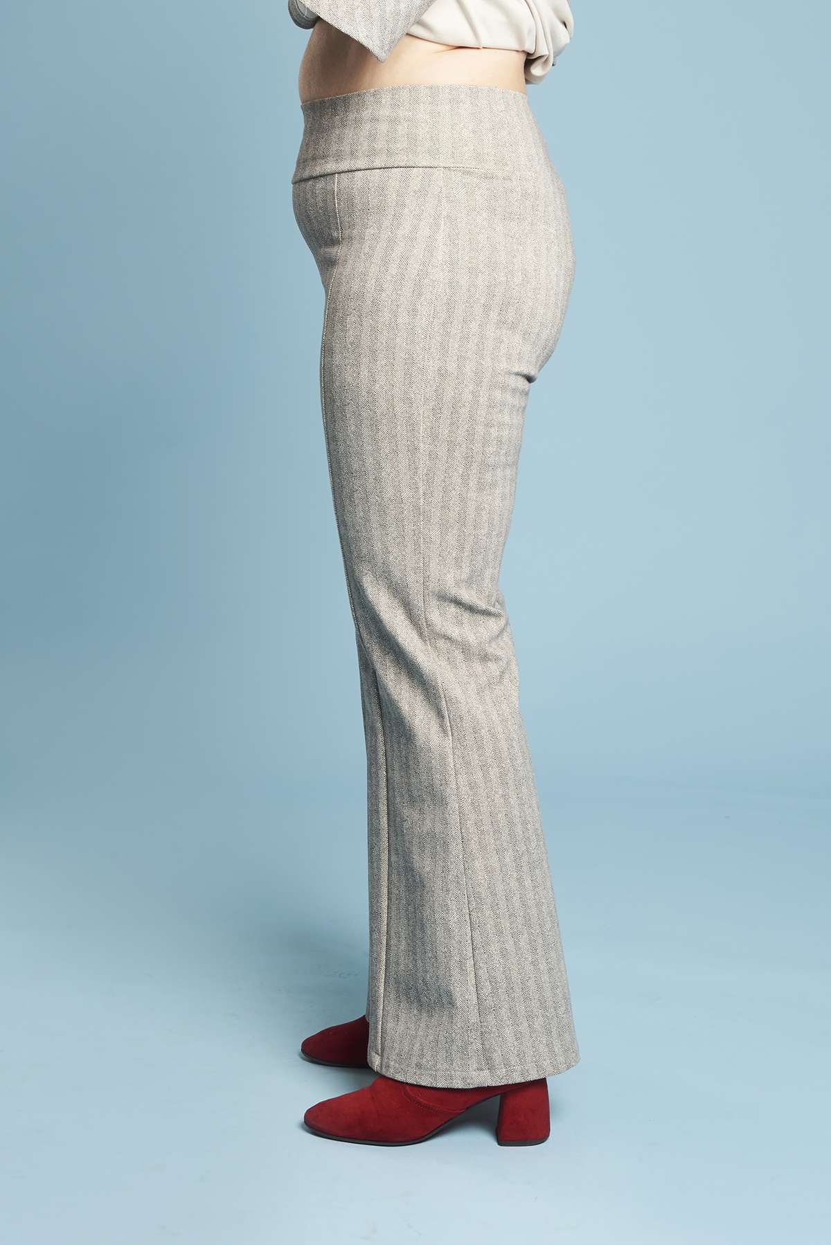 Una variazione del pantalone Comfy palazzo, gamba ampia con fascia alta in vita.