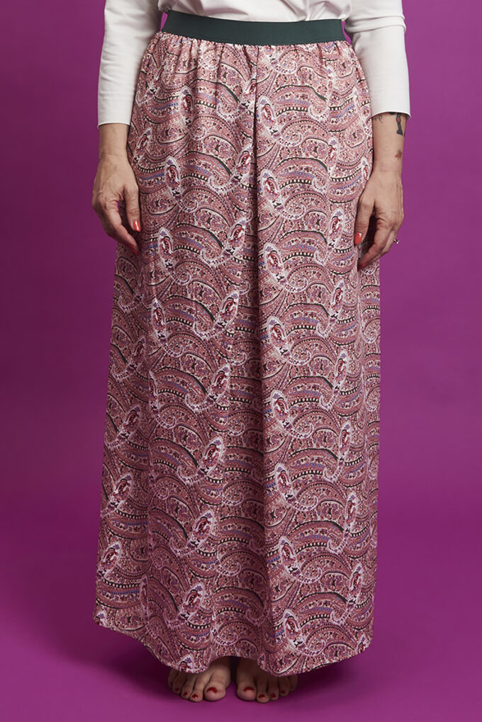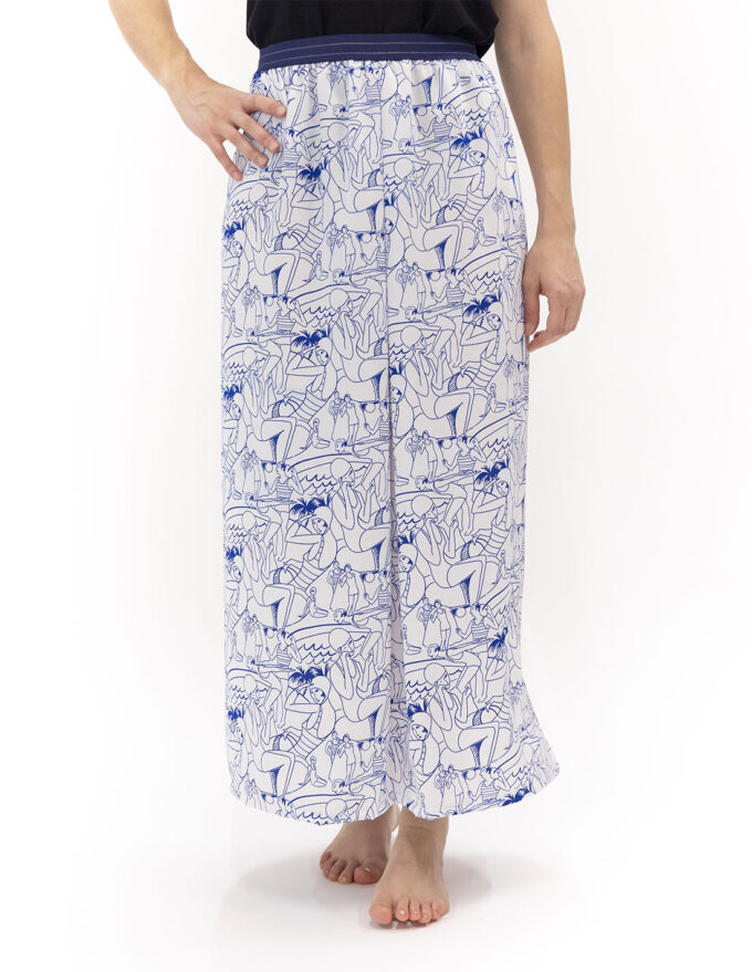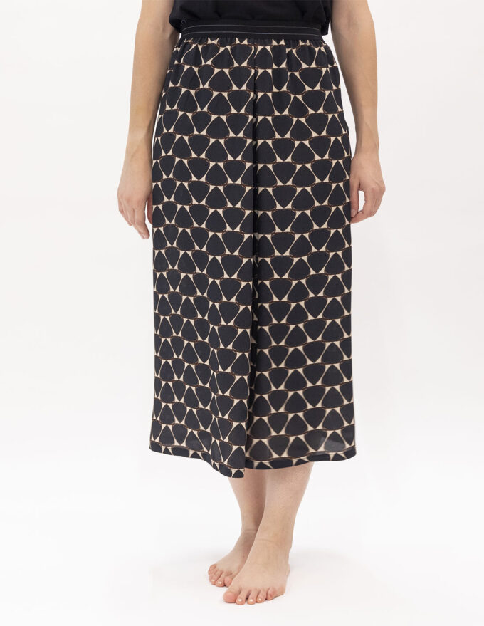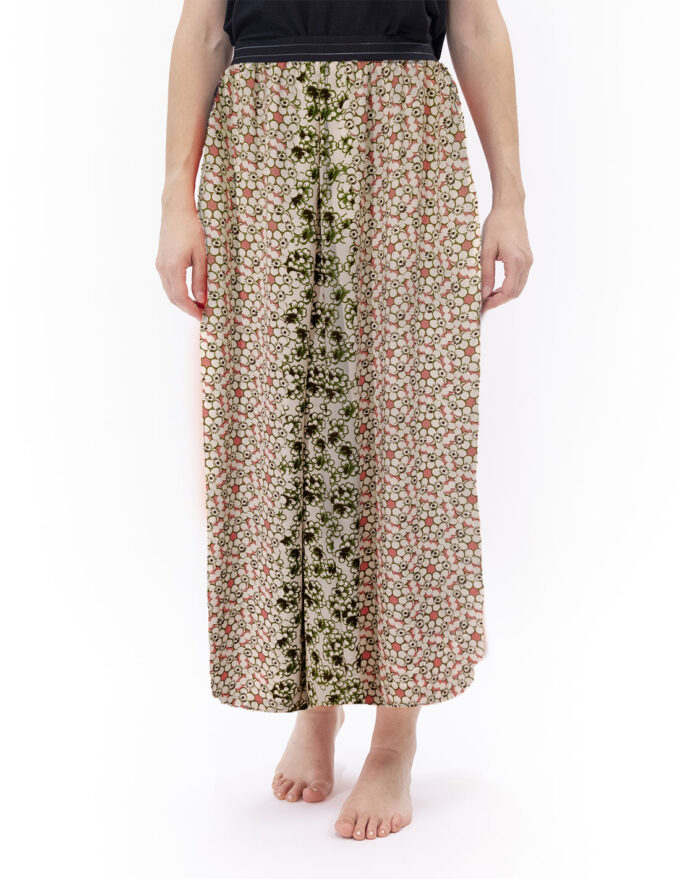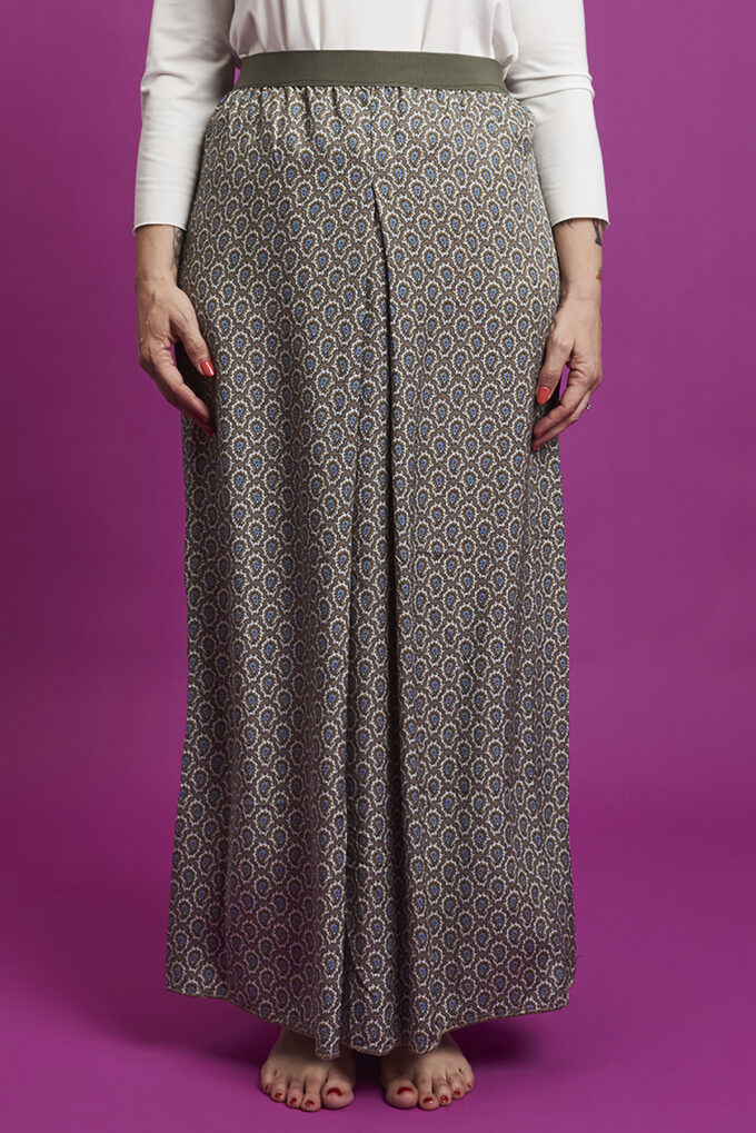 Una gonna dritta e ampia, chiusa a portafoglio con l’elastico in vita.