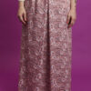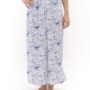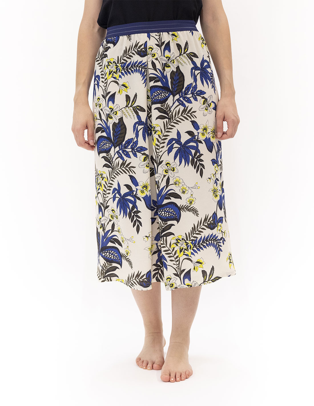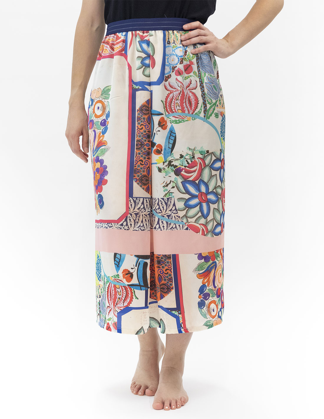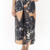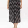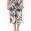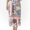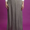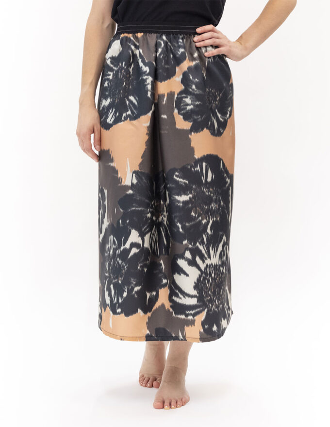 Una gonna dritta e ampia, chiusa a portafoglio con l’elastico in vita.