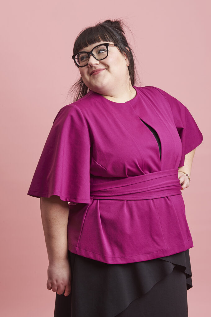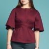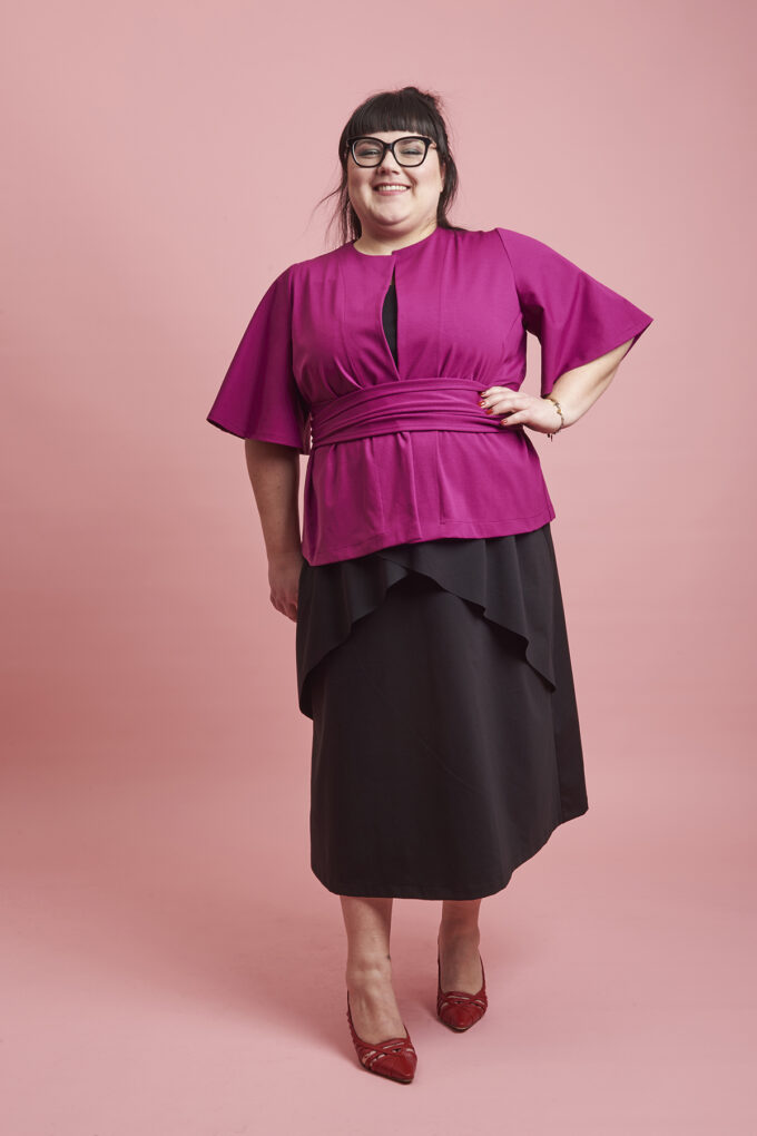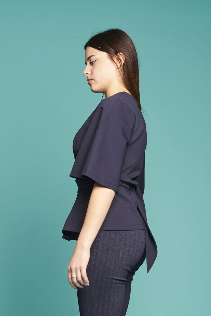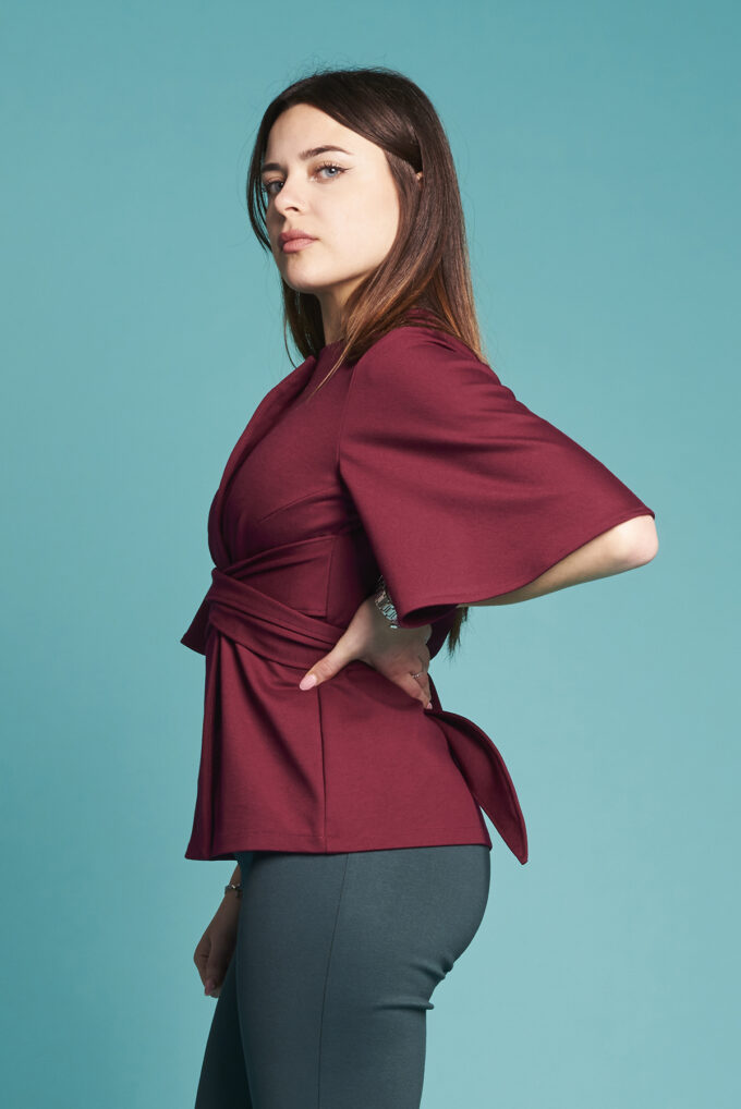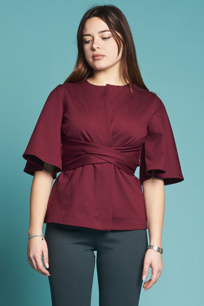 La giacca Campanula è confezionata in tessuto Punto Milano, pensata per la stagione autunnale, la manica è al gomito o a tre quarti, è aperta davanti, chiusa da due code di tessuto in sormonto, quindi perfetta su ogni fisico e sempre morbida,  per un look romantico e grintoso allo stesso tempo.