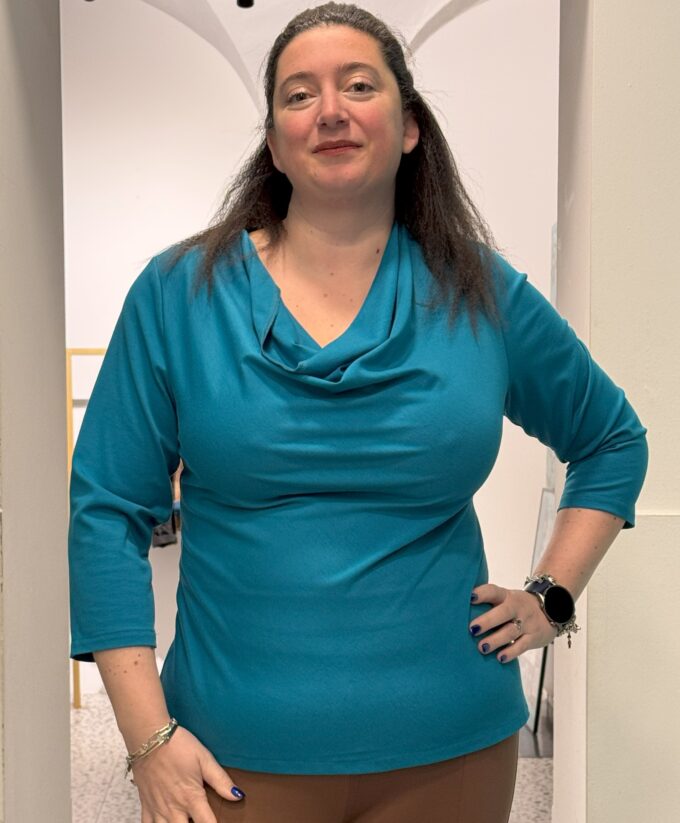 Se hai amato la maglia Parigi, dalla sua linea pulita ma non scontata la nuova maglia ETNA ti conquisterà, dallo scollo a cratere, per accompagnare il seno in un corpetto modellante ma non aderente che mimetizza anche la pancia. Le cuciture sul retro modellano accompagnando la linea anche a chi ha molta differenza tra il punto vita e i fianchi