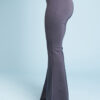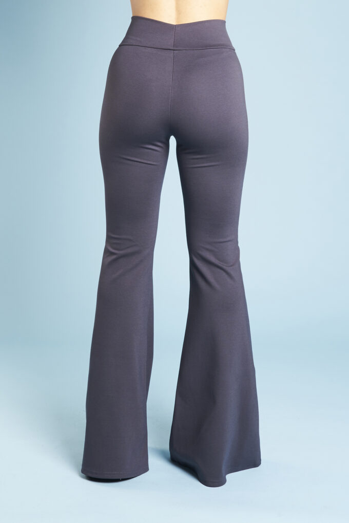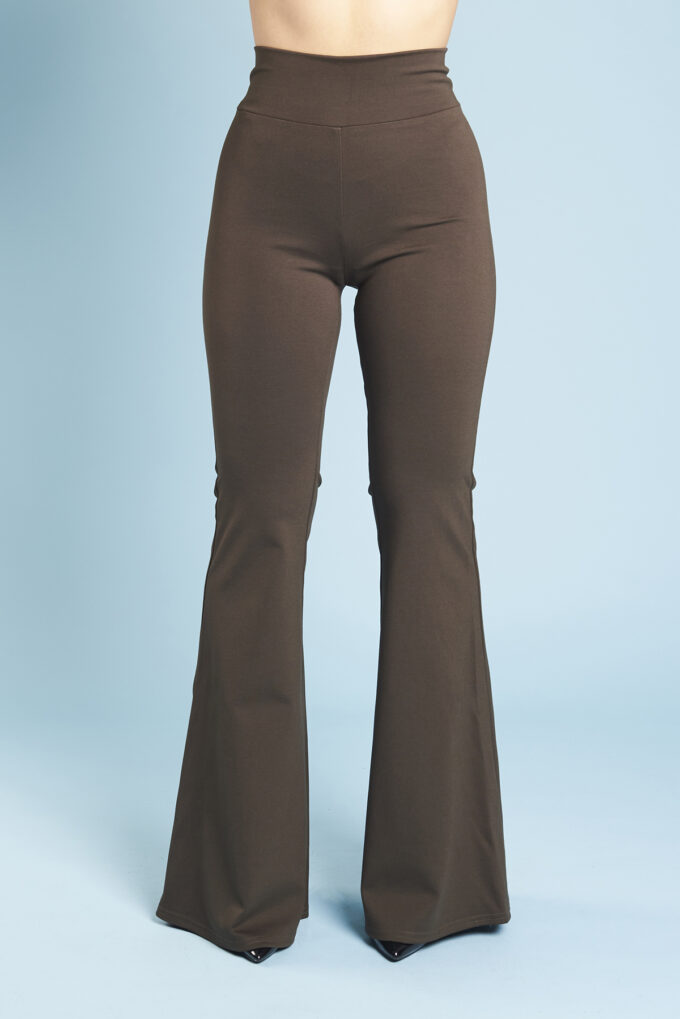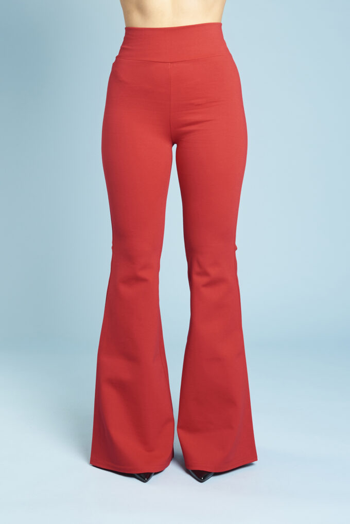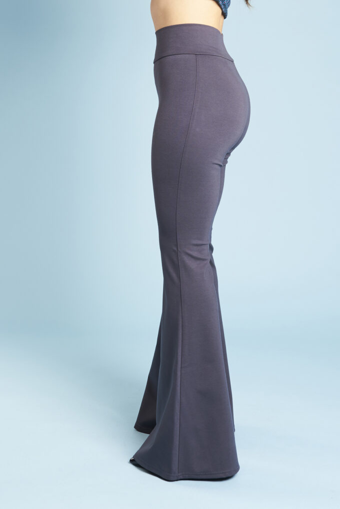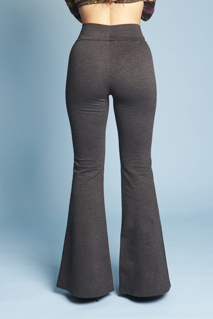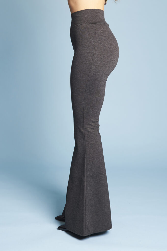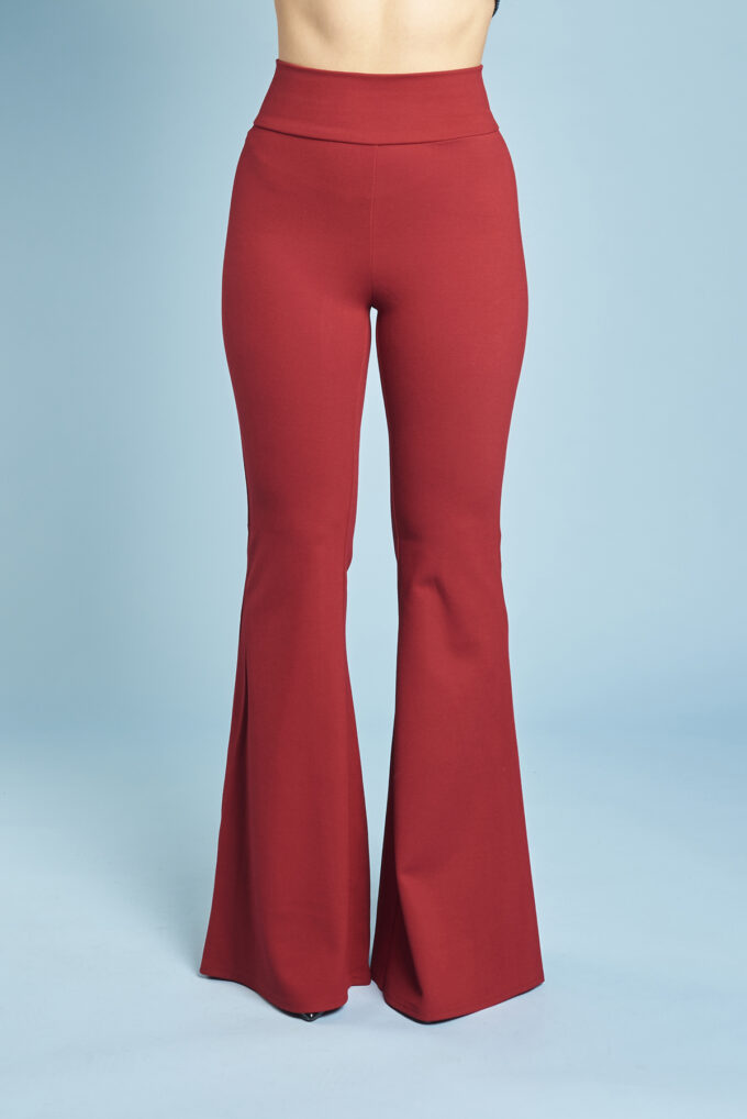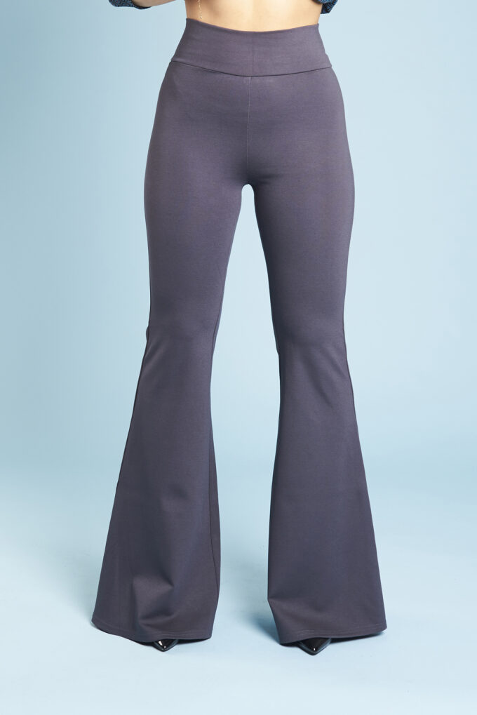Una variazione del pantalone slim, gamba svasata a zampa di elefante, lunghi e con fascia alta in vita.