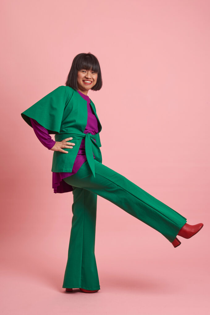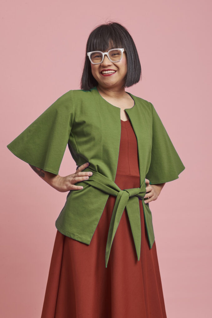 La giacca Campanula è confezionata in tessuto Punto Roma, pensata per la stagione primaverile, la manica è corta o al gomito, è aperta davanti, chiusa da due code di tessuto in sormonto, quindi perfetta su ogni fisico e sempre morbida,  per un look romantico e grintoso allo stesso tempo.