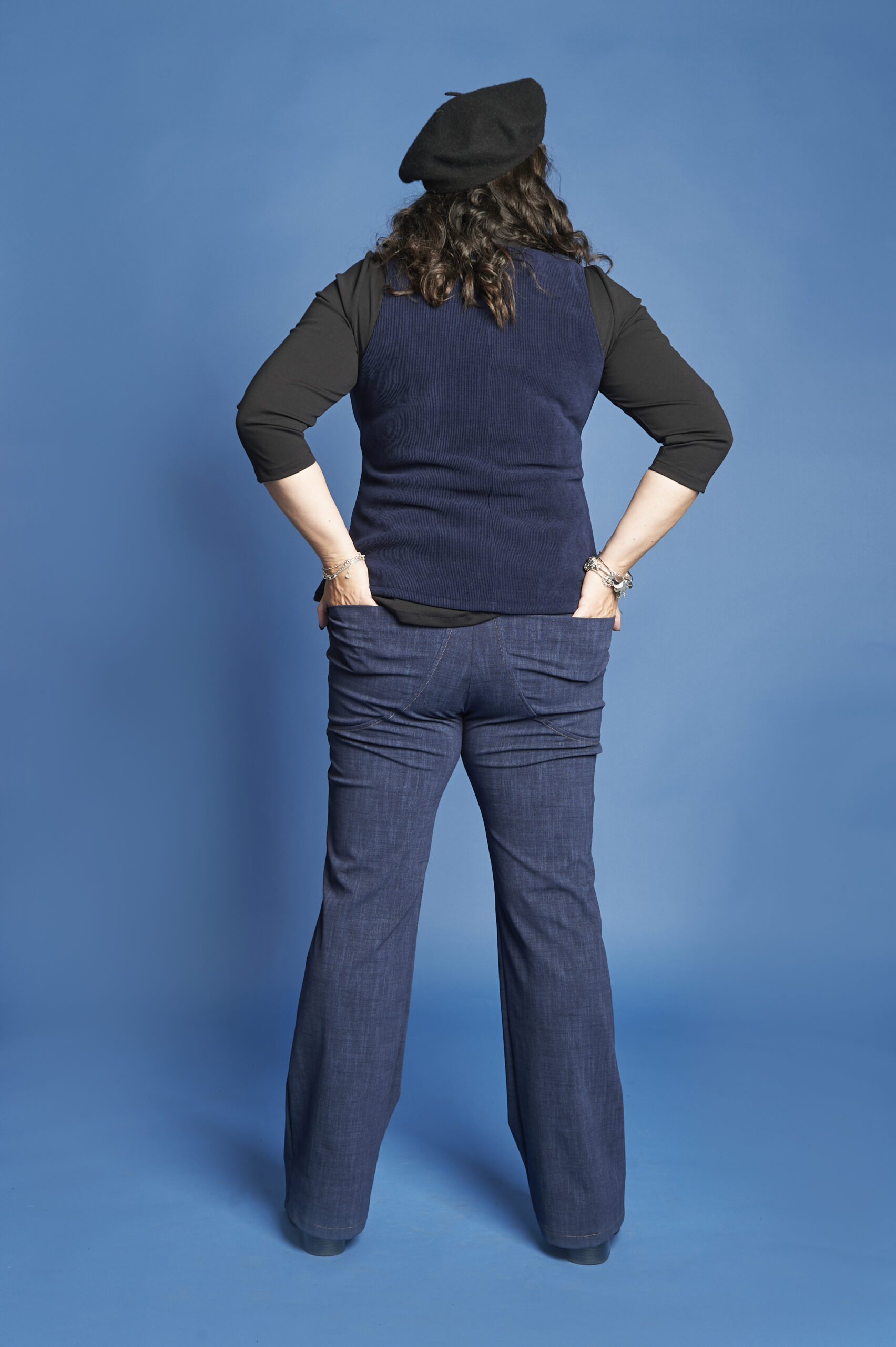 gamba dritta, fascia alta in vita, tasche sul retro.