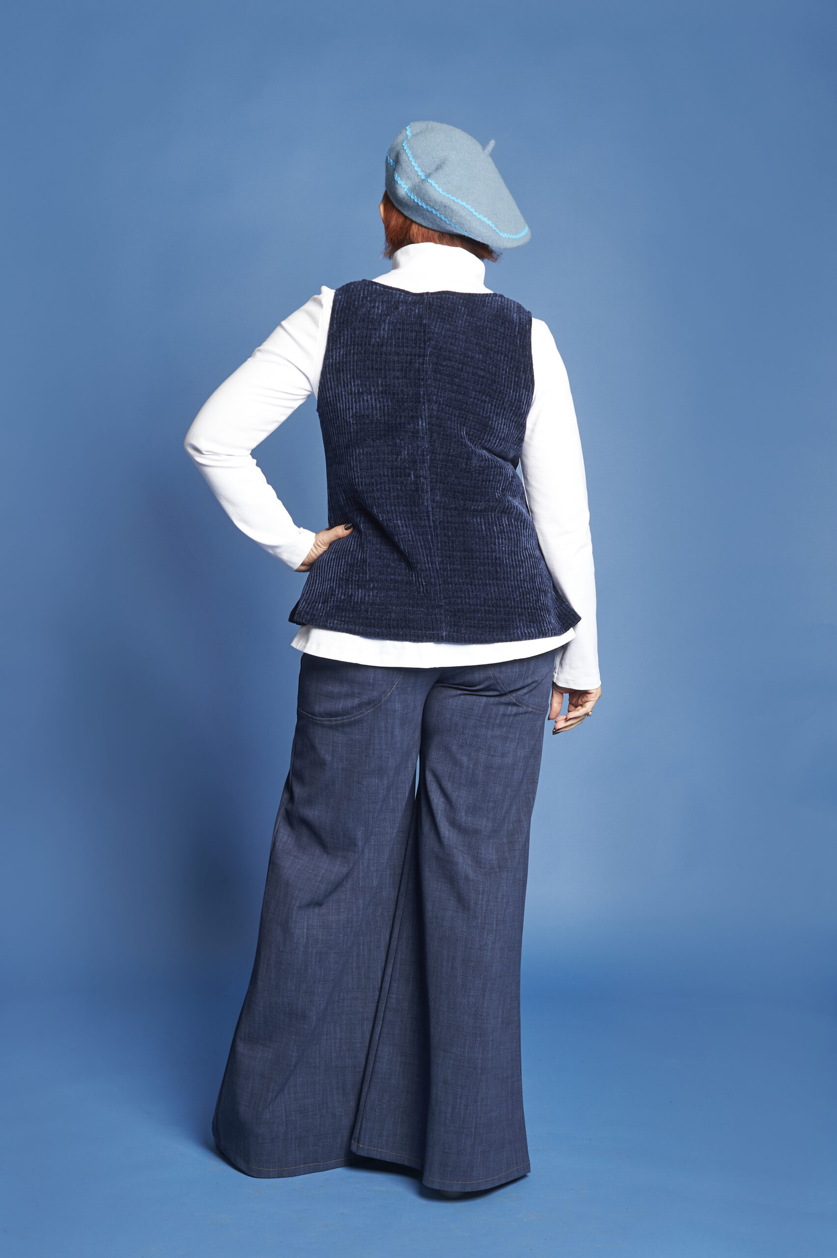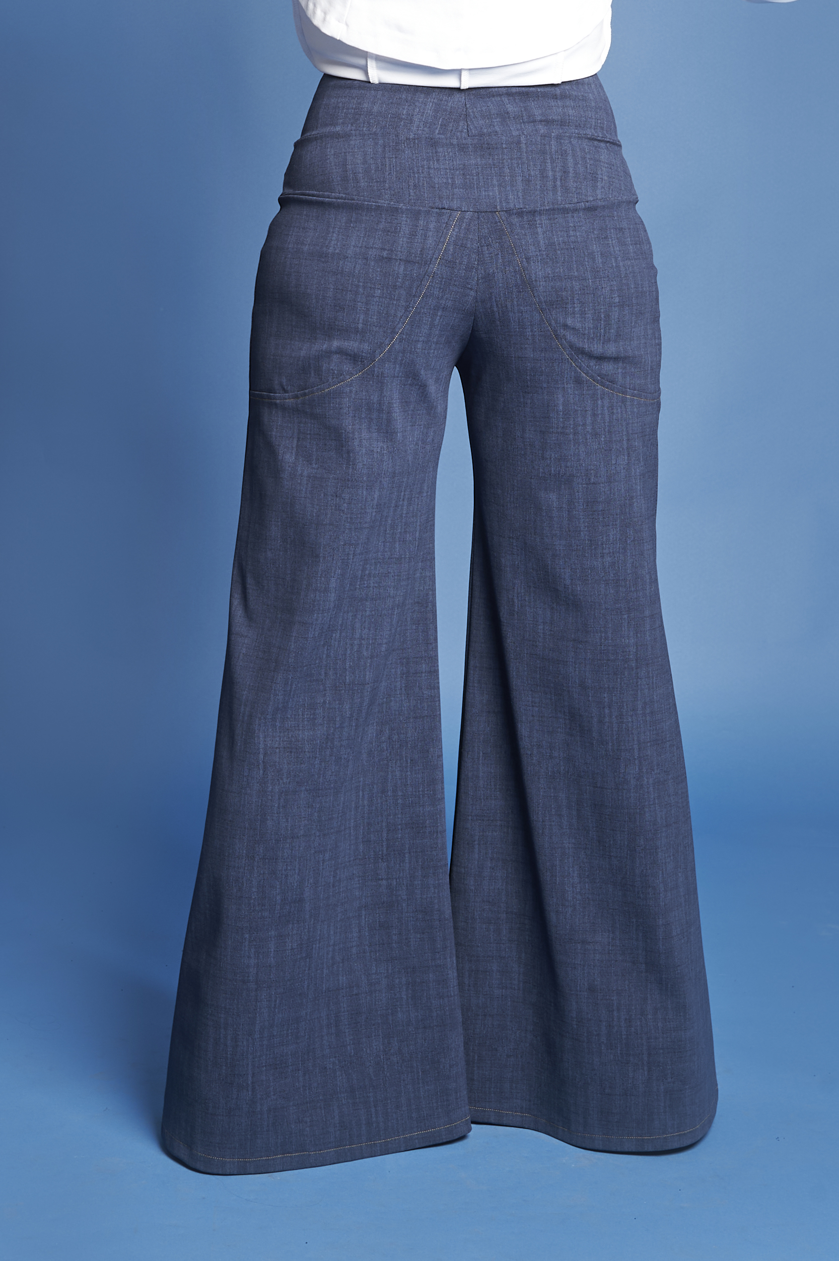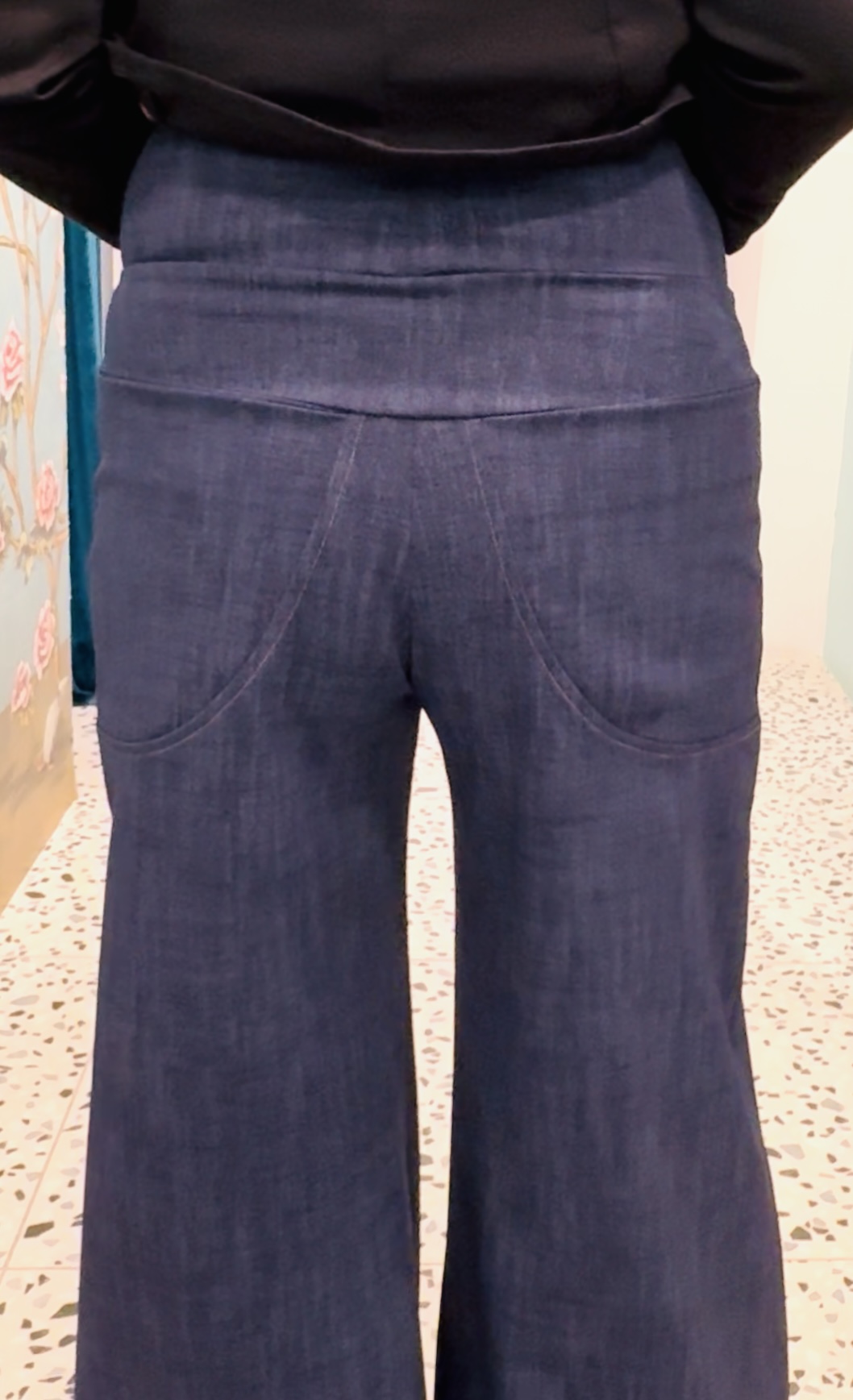 Una variazione del pantalone Comfy palazzo, gamba ampia con fascia alta in vita, tasche sul retro.