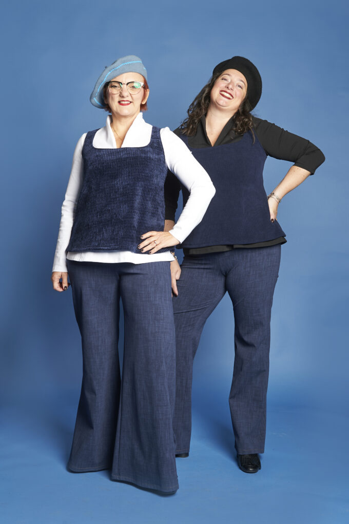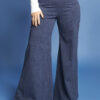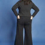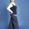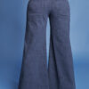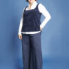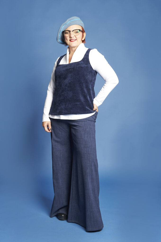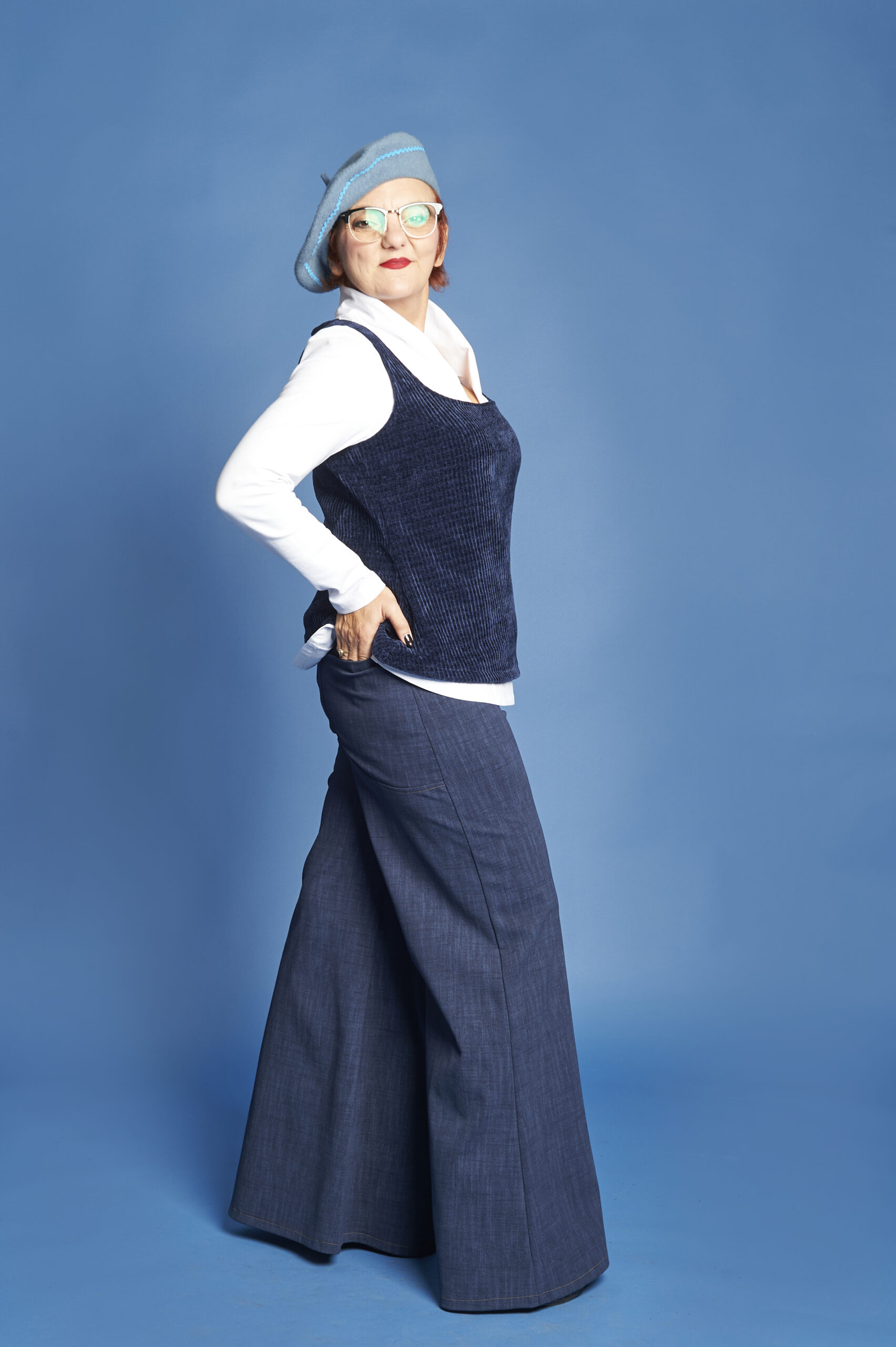 Una variazione del pantalone Comfy palazzo, gamba ampia con fascia alta in vita, tasche sul retro.