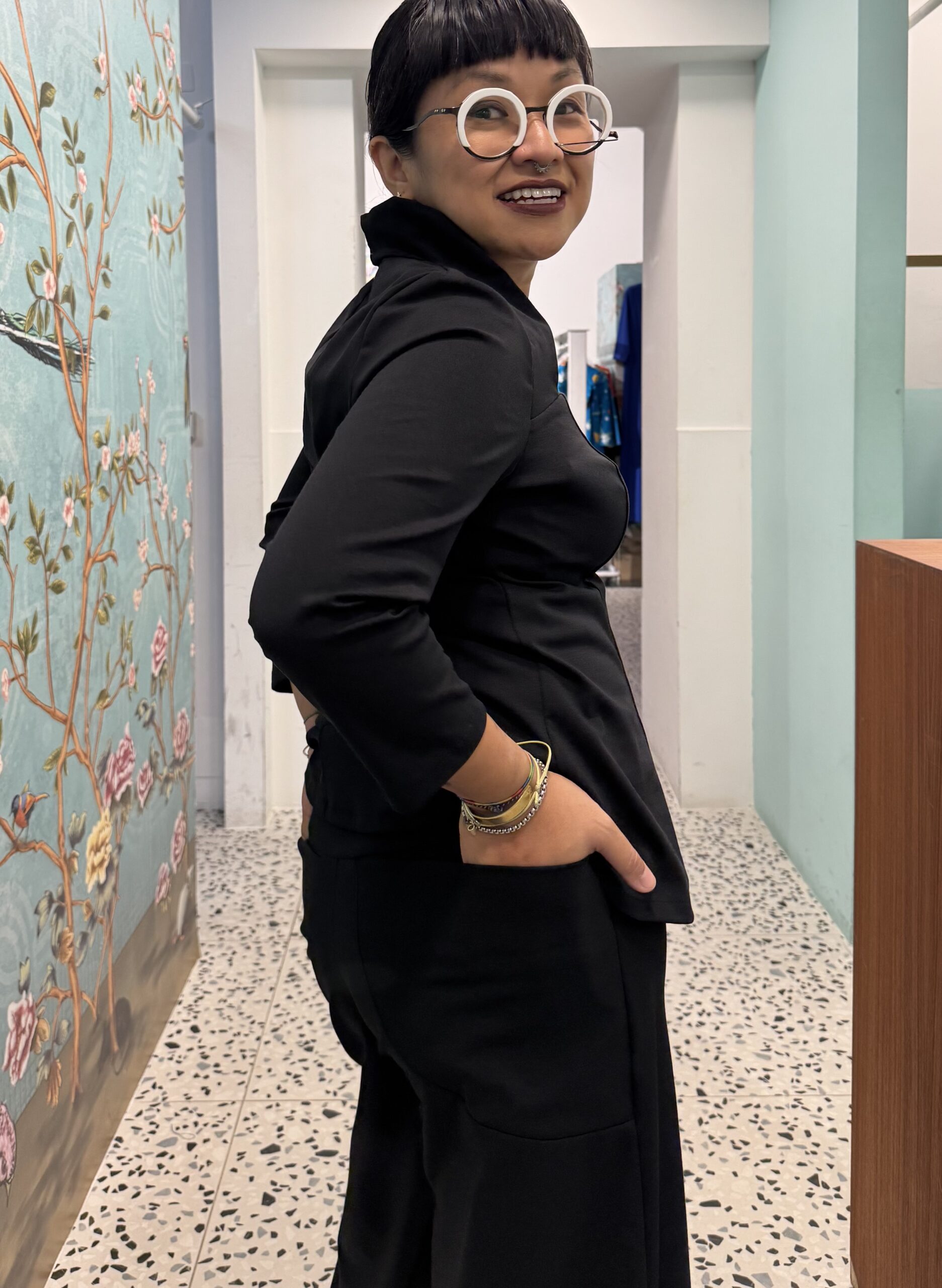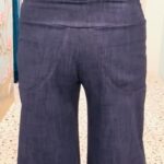 Una variazione del pantalone Comfy palazzo, gamba ampia con fascia alta in vita, tasche sul retro.