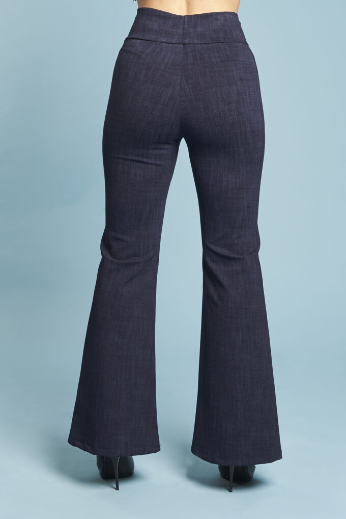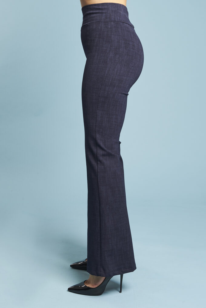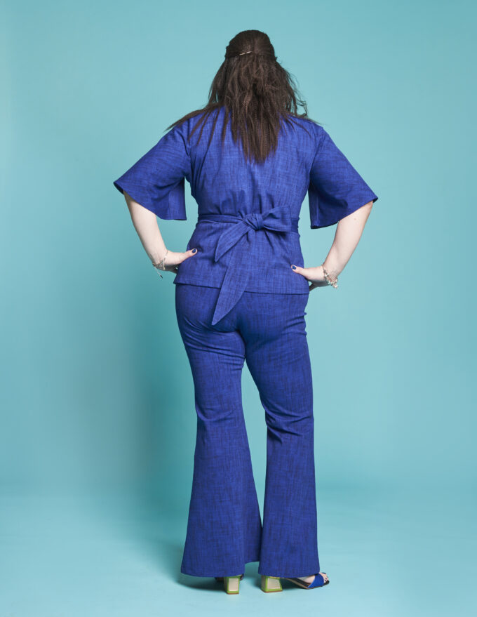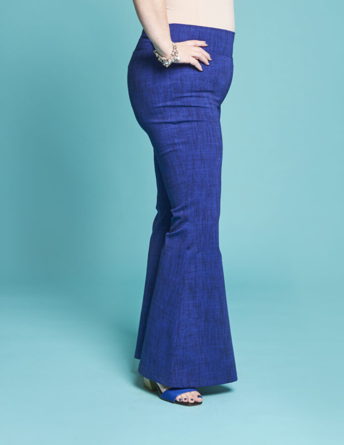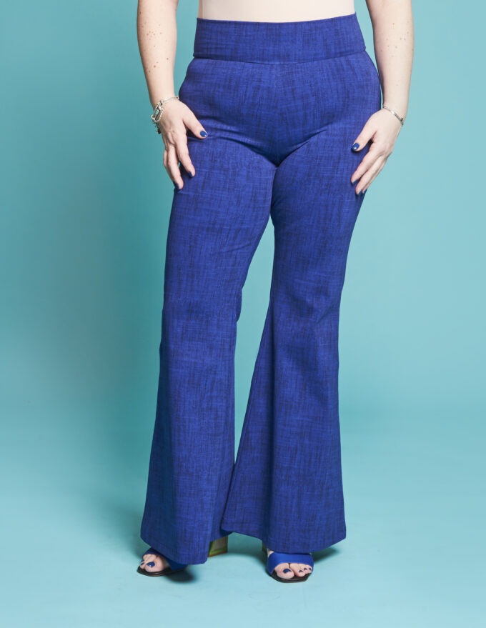 Una variazione del pantalone Comfy palazzo, gamba ampia con fascia alta in vita.