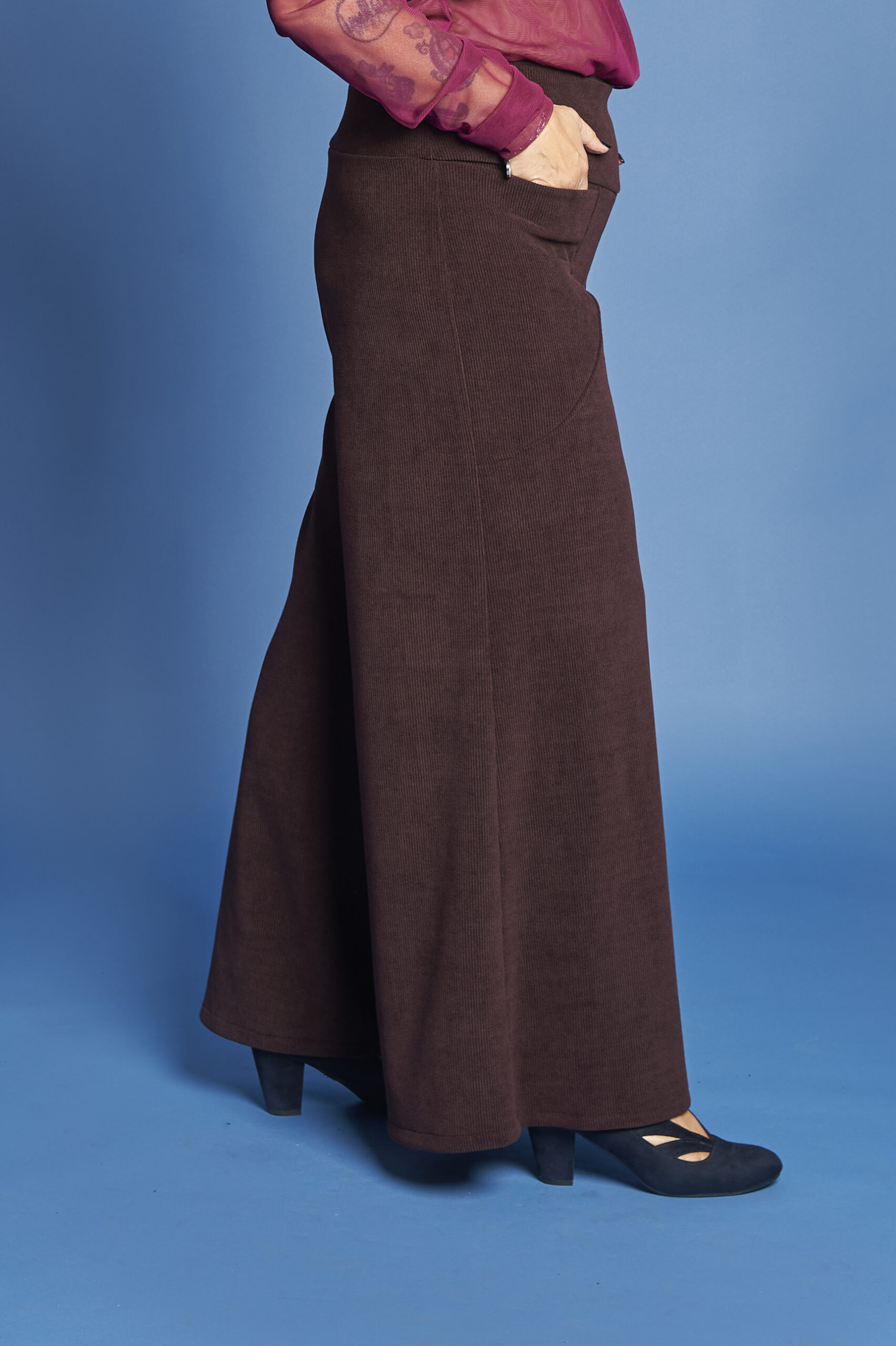 Pantaloni in velluto a coste grandi o piccole , taglio a palazzo, tasche inserite nel fronte.